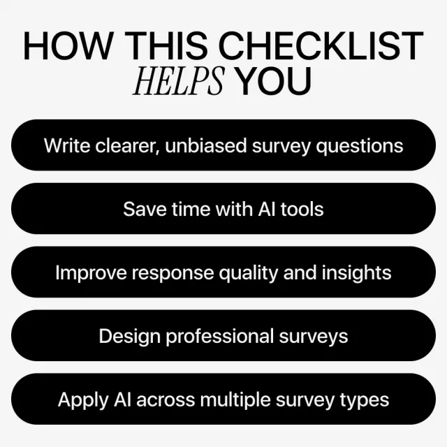 This checklist is ideal for marketers, UX researchers, business owners, students, educators, data analysts, and anyone interested in creating better surveys with AI. It’s beginner-friendly while still offering valuable insights for experienced professionals looking to upgrade their workflow.