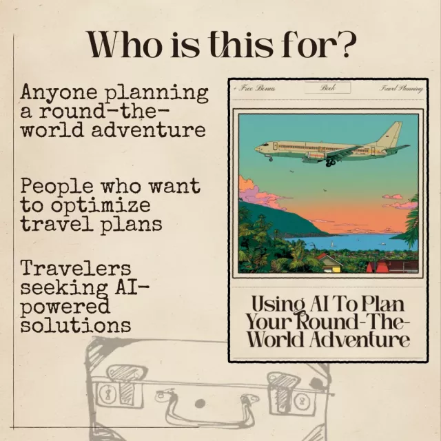 This eBook is perfect for anyone planning a round-the-world trip. Whether you’re a digital nomad, a first-time traveler, or an adventure seeker looking to explore multiple destinations, this guide is tailored to help you navigate the complexities of flight planning using AI tools. It’s ideal for those who want to save time, reduce stress, and make the most of their travel budget.