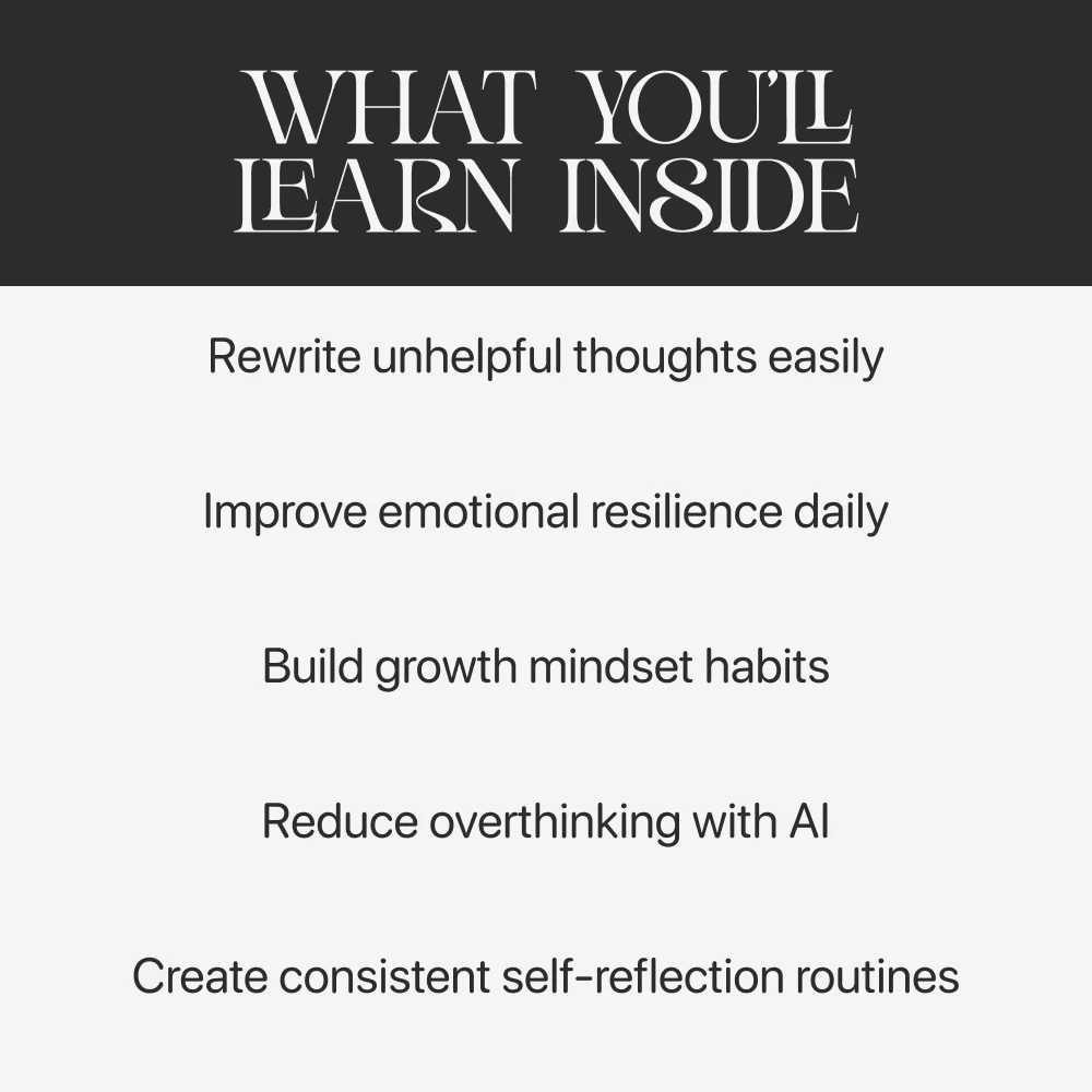 Unlike generic mindset guides, this resource focuses specifically on blending cognitive reframing with AI tools. It doesn’t just teach theory, it shows you how to use ai to rewrite unhelpful thoughts through real examples, tested prompts, and repeatable daily practices. You’re not just reading advice, you’re getting a usable system designed for modern life.