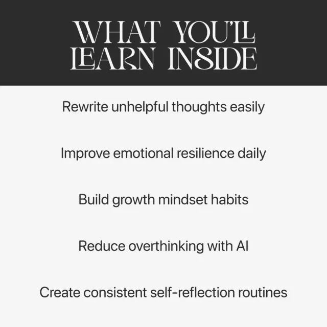 This digital guide is perfect for anyone who struggles with self-doubt, overthinking, anxiety, or negative self-talk. It’s ideal for beginners curious about personal development, professionals feeling mentally stuck, and anyone interested in learning a simple system using AI for emotional and mindset growth. Even if you’ve never used AI before, this guide shows you how to use ai to rewrite unhelpful thoughts step by step.