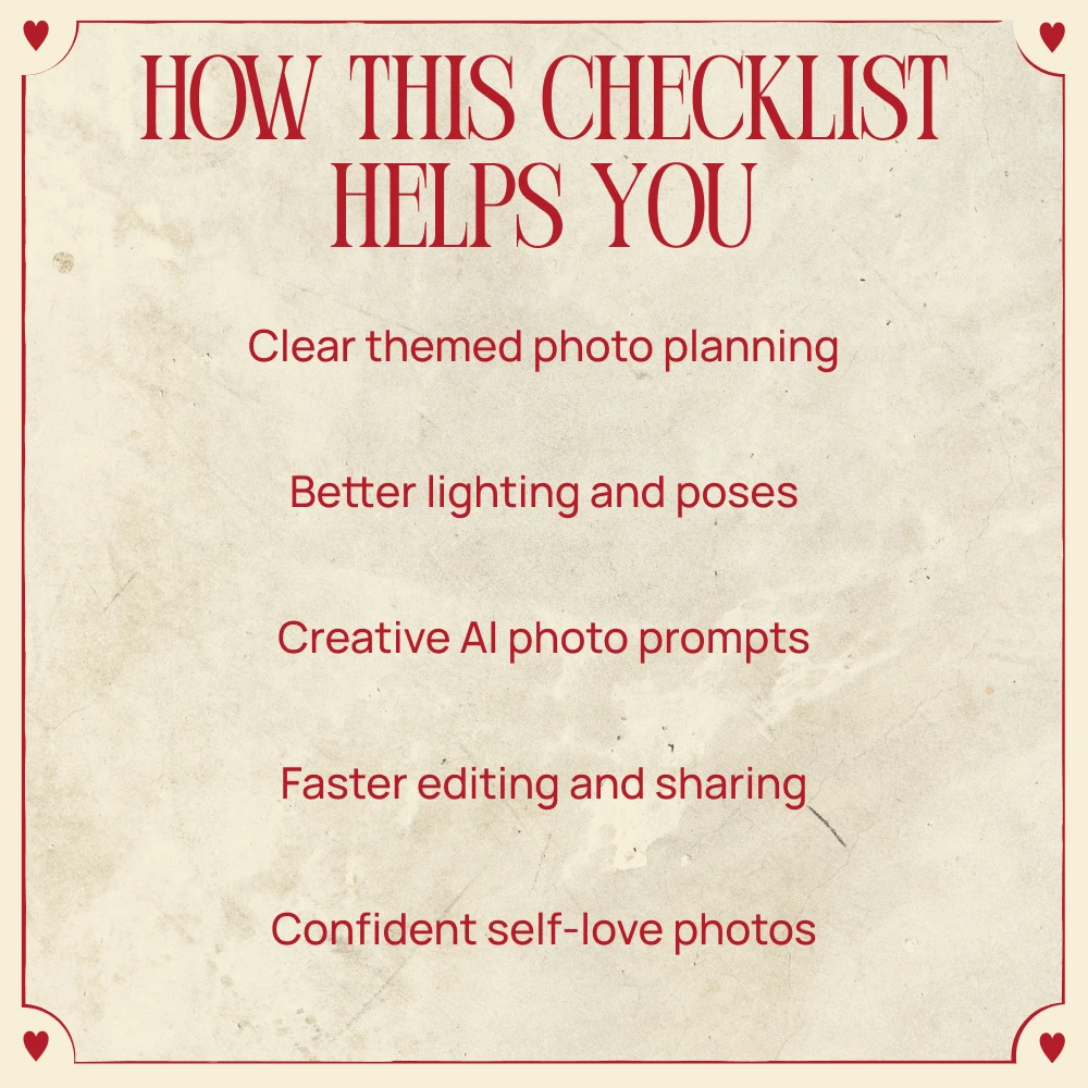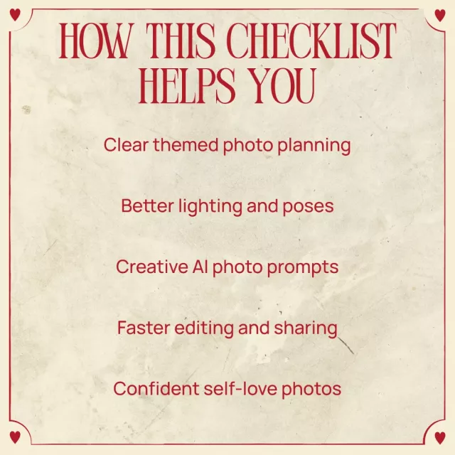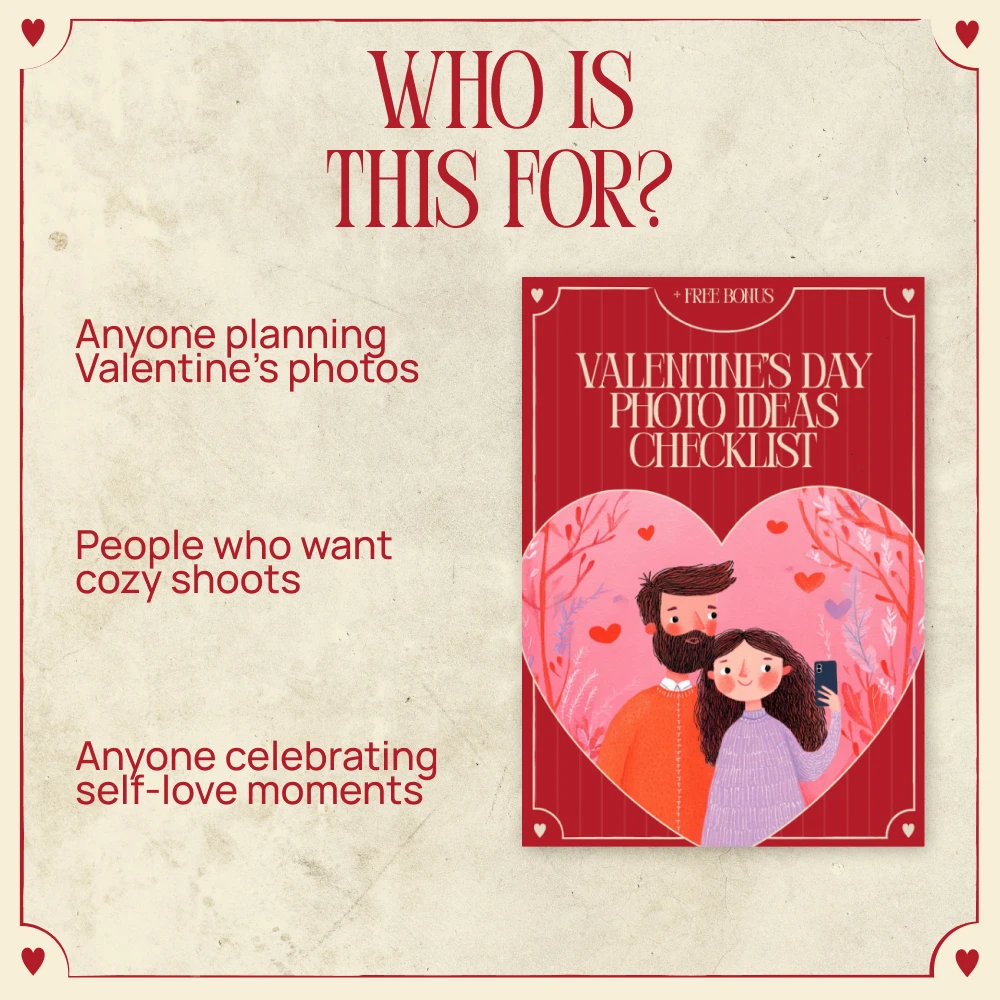 This checklist is ideal for couples planning a romantic shoot, individuals celebrating self-love, friends capturing fun memories, influencers creating seasonal content, and small business owners needing festive visuals. If you want polished, intentional valentine’s day photo ideas without hiring a photographer, this resource is for you.