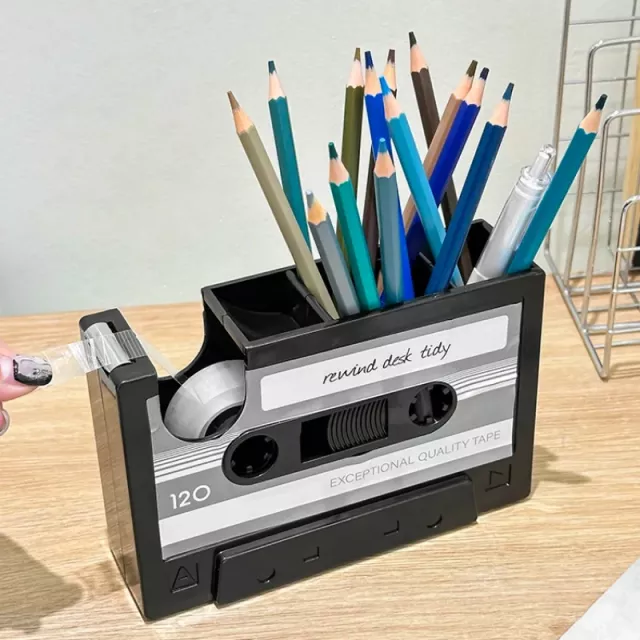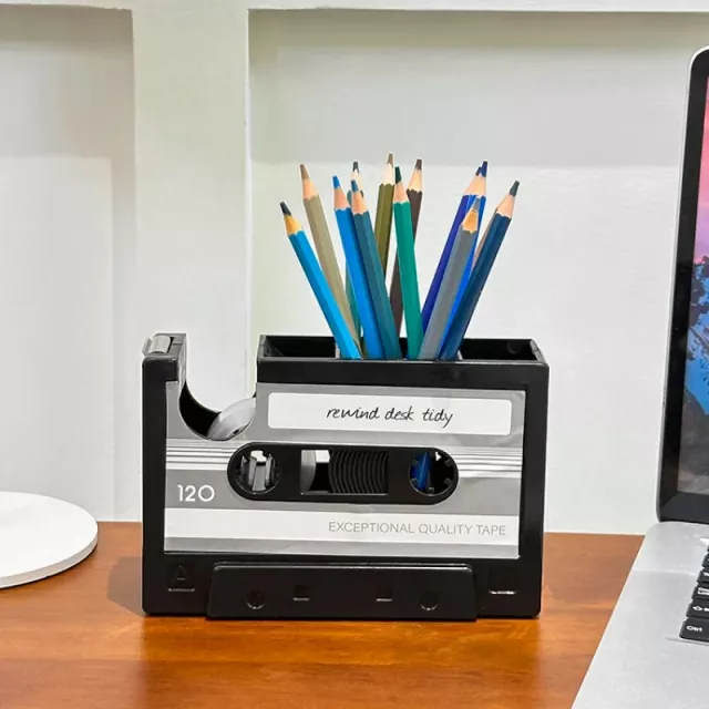 Designed to capture the look of a classic cassette tape, this pen holder doubles as a tape dispenser, making it both decorative and practical. Its sturdy construction ensures stability on your desk, while its spacious compartment easily holds writing tools and small office essentials. The built-in tape cutter is perfectly positioned for quick, hassle-free use. Measuring approximately 6.3 inches in length, it fits comfortably on any desk without taking up too much space.