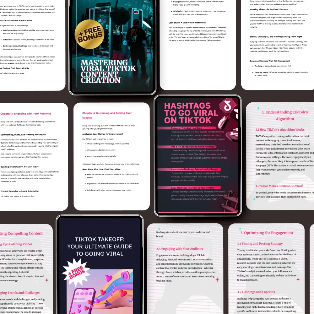 • TikTok Takeoff: Your Ultimate Guide to Going Viral – Master the essential strategies for creating viral content that grabs attention and keeps viewers engaged.