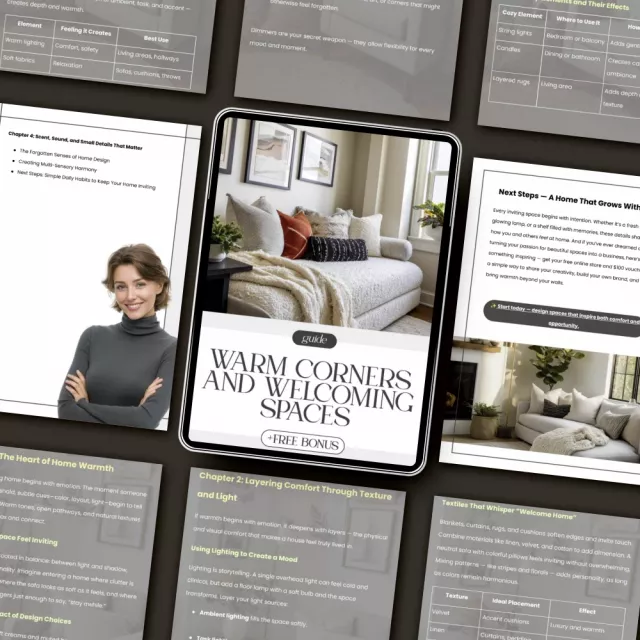 Unlike generic decor eBooks, Warm Corners and Welcoming Spaces focuses on the emotional connection between people and place. It’s not just about furniture or colors—it’s about crafting an atmosphere that welcomes you back, every single day. Each chapter offers relatable insights and clear next steps so you can turn inspiration into reality with confidence and joy.