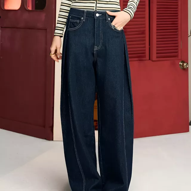 These jeans are crafted from a premium blend of cotton, polyester, and lyocell for breathability, durability, and a smooth drape. The fabric is non-stretch, giving them a structured, high-quality feel that keeps their shape all day. The high-waist design sits comfortably above the hips, visually lengthening your legs, while the loose wide-leg fit offers a flattering, flowing look. Full-length coverage with an approximate 30–32 inch inseam makes them ideal for most heights. A secure front zipper and functional pockets complete the design for everyday practicality.