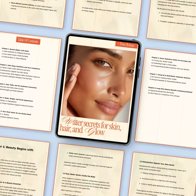 Unlike generic hydration tips, this ebook connects hydration directly to visible beauty results and daily habits. It blends science, real-life examples, and modern tools like AI to help you personalize your routine—making it practical, modern, and results-focused.