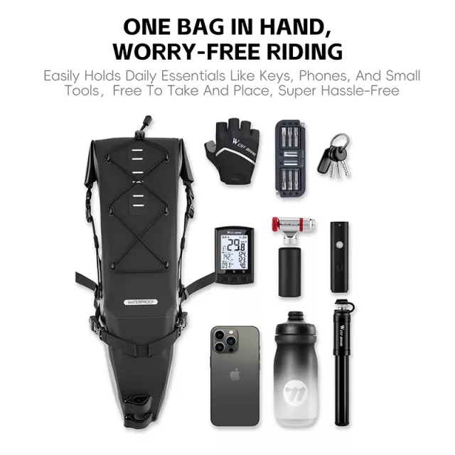 Whether you’re hitting rugged mountain trails or cruising on smooth roads, this waterproof bicycle saddle bag is built to keep your essentials safe, dry, and within reach. With a spacious 12.5L capacity, it’s perfect for long-distance rides, weekend adventures, or daily commutes. The durable waterproof material shields your belongings from rain, splashes, and mud, so you can focus on the ride without worrying about the weather.