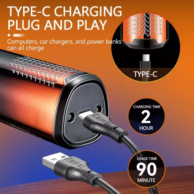 This high-performance shaver is powered by a rechargeable engine that delivers exceptional speed and efficiency. With just 2 hours of charging, you get up to 90 minutes of continuous use — enough for several grooming sessions. The whole body washable design makes cleaning quick and hassle-free, while the universal voltage compatibility means you can take it anywhere in the world. The ergonomic shape ensures a secure grip, even when wet, for total control during every shave.