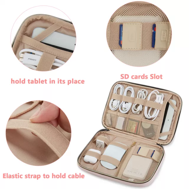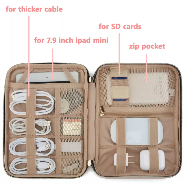 This organizer offers a well-thought-out layout to keep your electronics safe and accessible. Featuring 7 slip-resistant elastic loops, it securely holds cables, chargers, and even a mouse. A padded pocket is specially designed for your 7.9″ iPad Mini, while mesh compartments, SD card holders, and elasticized segments provide flexibility for all your small accessories. The two-way zipper closure allows for quick access, making it easy to grab what you need without any hassle.