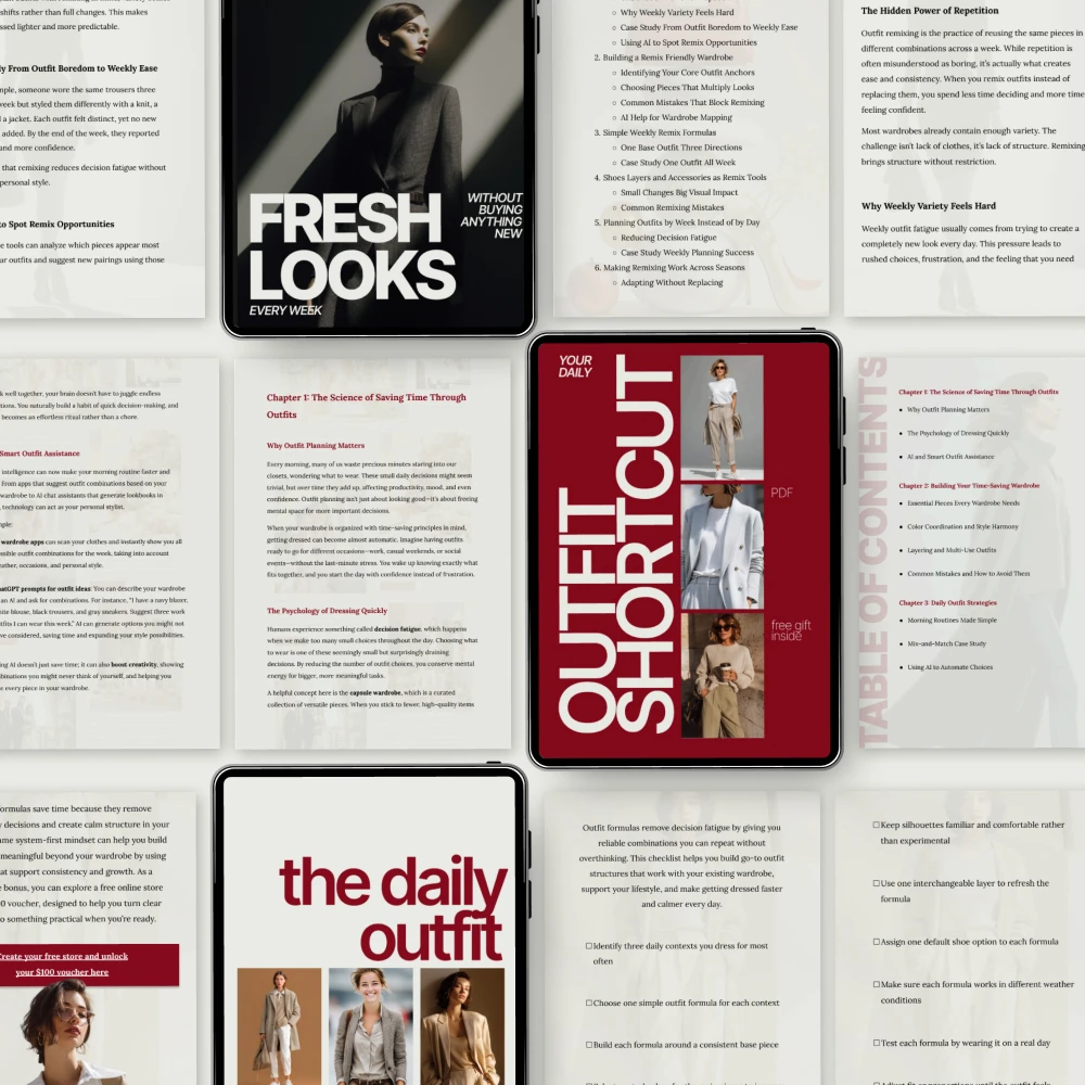 Unlike other outfit guides that may offer generic advice, Weekly Outfit Remixing Made Simple provides actionable and personalized steps to remix outfits for every week. You’ll learn how to make the most of what you already have, helping you create fresh looks without ever needing to buy anything new. The combination of guides, formulas, and checklists is designed to give you everything you need to transform your wardrobe with minimal effort, ensuring that you always feel put-together and ready to face the day.