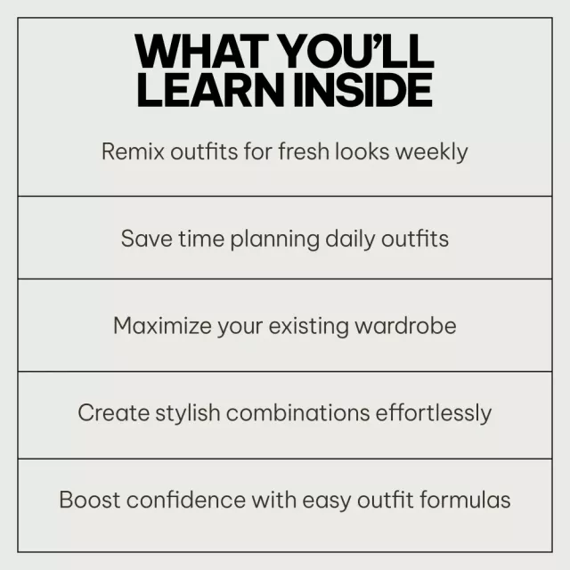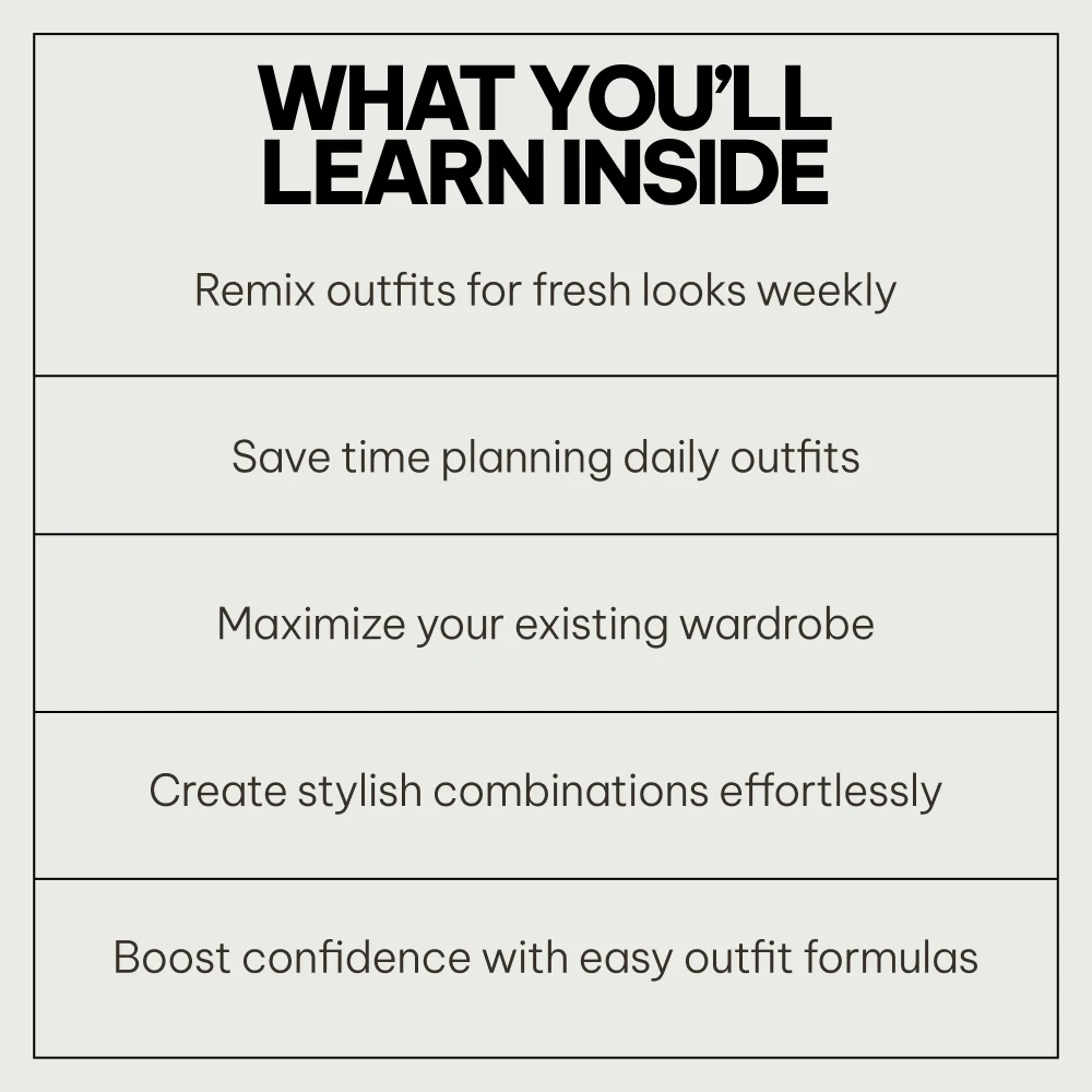 • The Daily Outfit Formula: Step-by-step instructions on how to mix and match your existing pieces for endless outfit combinations.