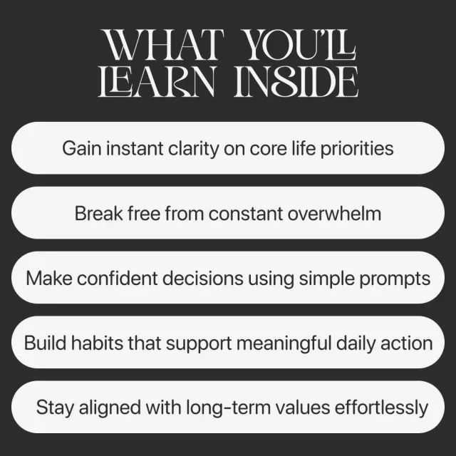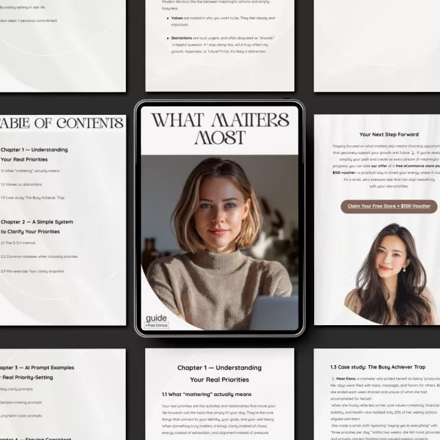 Unlike generic productivity resources, What Matters Most blends mindset, method, and modern AI support into one streamlined guide. You get a clear system, actionable prompts, and a lightweight structure you can apply immediately—no overwhelm, no jargon.