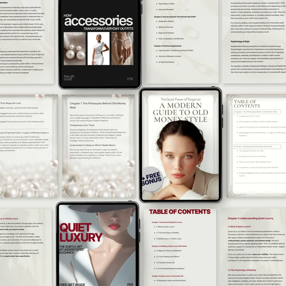 Unlock the secrets to mastering the art of understated elegance with our “What Quiet Luxury Really Looks Like” 5-in-1 Bundle. This carefully curated digital collection features five essential guides, eBooks, and checklists that provide you with everything you need to embrace the timeless appeal of quiet luxury. Whether you’re looking to refine your wardrobe or learn the subtle power of accessories, this bundle offers all the tools to transform your style and elevate your everyday look. Perfect for anyone who loves the idea of understated elegance and wants to understand the true meaning behind the quiet luxury style trend.