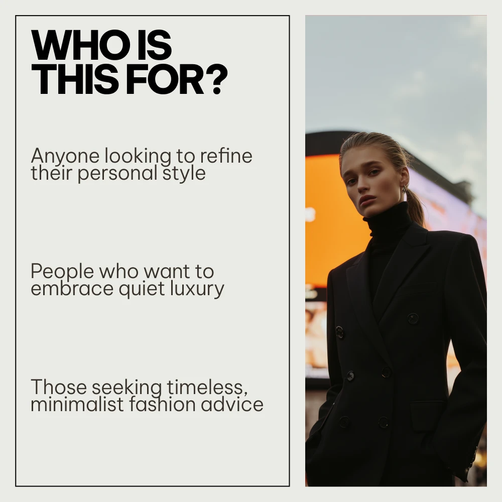 This bundle is designed for anyone who wants to embrace quiet luxury, including those who adore minimalist fashion, timeless elegance, and old money style. Whether you’re just discovering quiet luxury or looking to refine your existing wardrobe, this collection provides valuable insight into making understated elegance a part of your everyday life. It’s perfect for fashion enthusiasts, style seekers, and anyone looking to elevate their personal style without indulging in flashy trends.