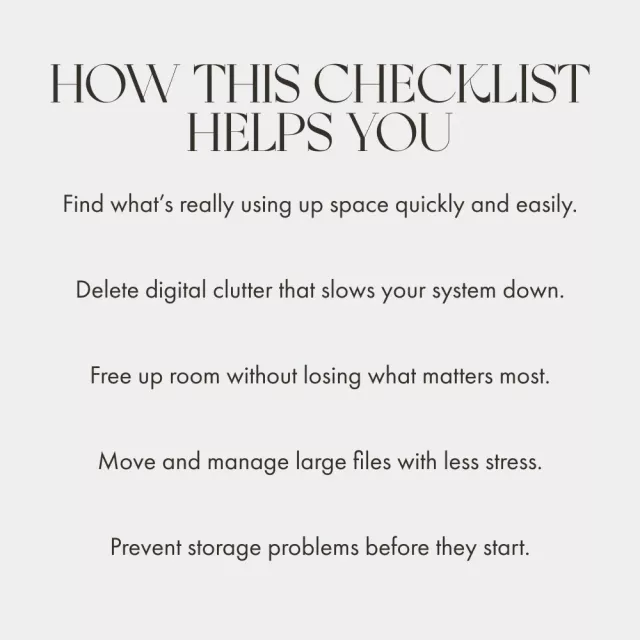 Anyone tired of constant “storage full” alerts! Whether you’re a student, entrepreneur, creator, or everyday user, this checklist helps you keep your digital life light and organized. It’s especially helpful for small business owners, content creators, and anyone managing multiple devices or large files.