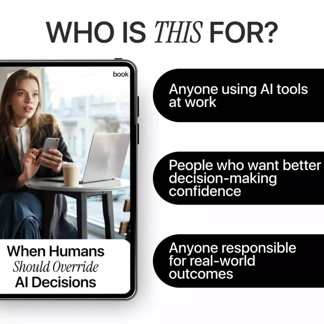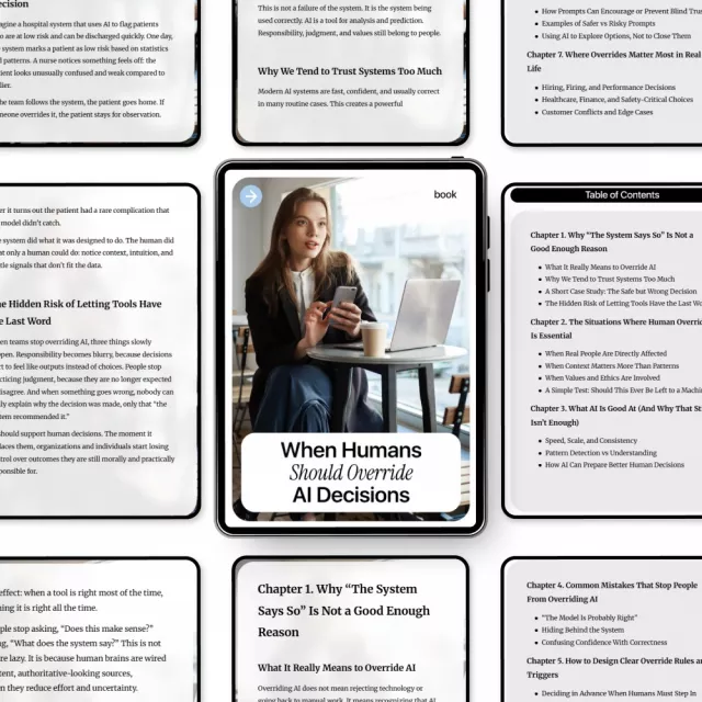 Unlike abstract AI ethics essays, When Humans Should Override AI Decisions is practical, grounded, and action-oriented. It focuses on real scenarios, clear tests, and usable frameworks you can apply immediately—without demonizing AI or glorifying automation.
