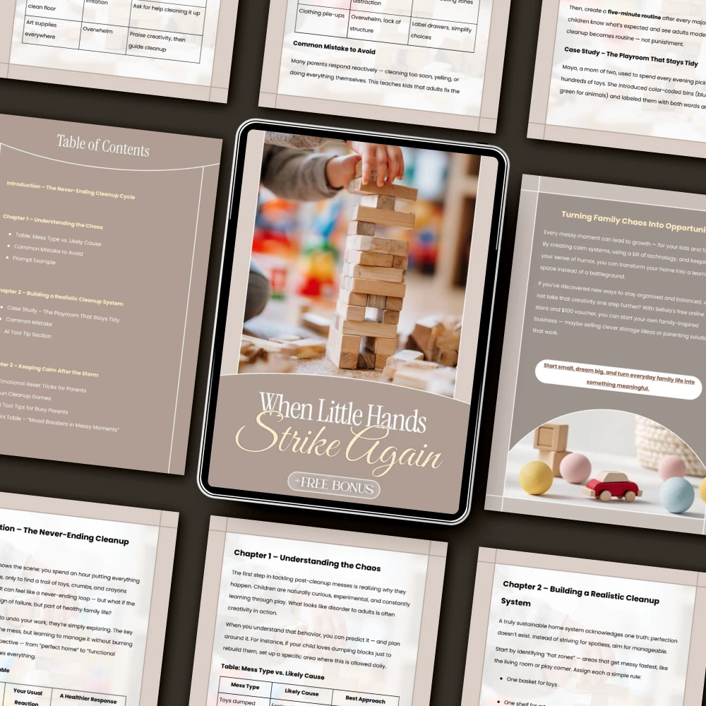 When Little Hands Strike Again is the must-have digital guide for every parent who’s ever sighed, “But I just cleaned that!” Designed for moms and dads navigating the daily whirlwind of toys, crumbs, and endless spills, this guide offers practical, sanity-saving strategies for what to do when kids mess after cleaning. With a blend of humor, empathy, and smart systems, you’ll learn how to handle the chaos calmly, transform cleanup time into learning moments, and finally enjoy a home that feels lived in—without losing your mind.