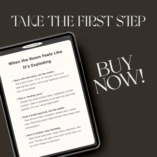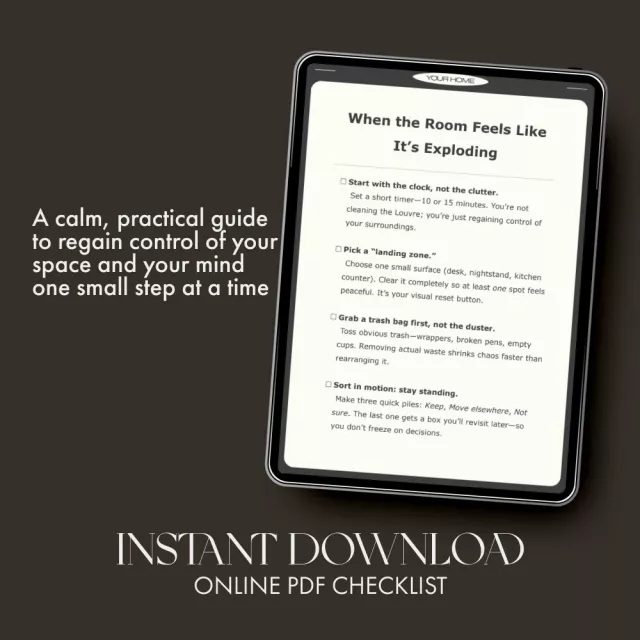 When the Room Feels Like It’s Exploding is your quick, compassionate checklist for the moments when your space—and your mind—feel like too much. This digital download is a simple, no-stress guide that helps you regain clarity and control in 15 minutes or less. Designed for anyone who’s ever stood in the middle of a messy room not knowing where to start, it’s your go-to reset button for both your environment and your energy.