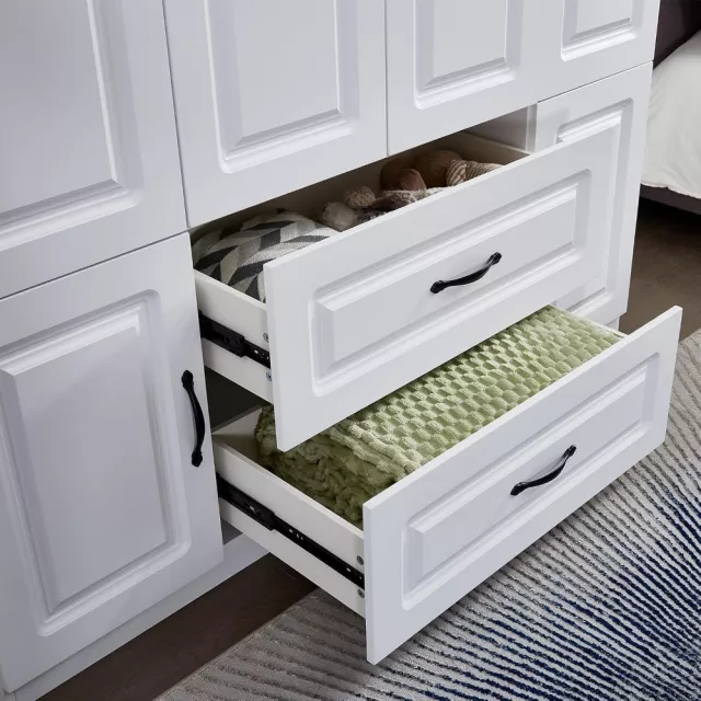 Its crisp white finish with subtle embossing and chic black metal handles makes it a stylish centerpiece that complements both contemporary and minimalist bedrooms. With a height of nearly 71 inches and a width of 63 inches, this tall cabinet offers ample room to house everything from seasonal coats to your daily essentials.