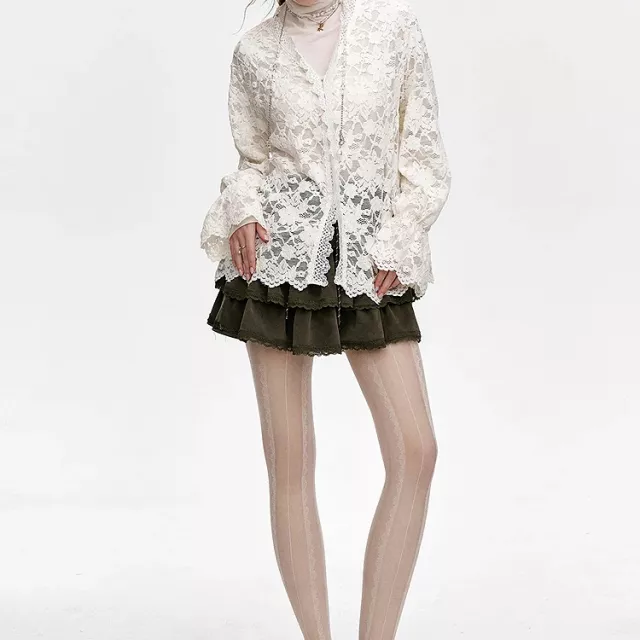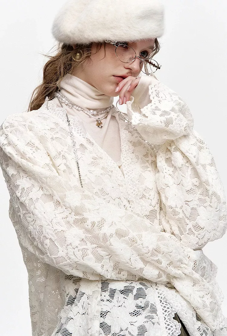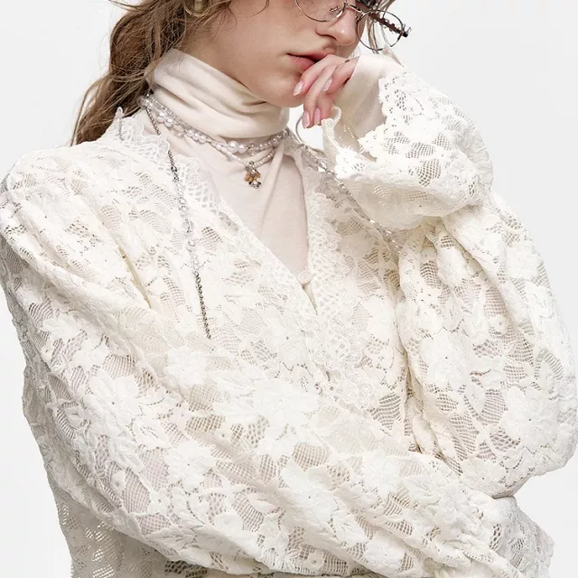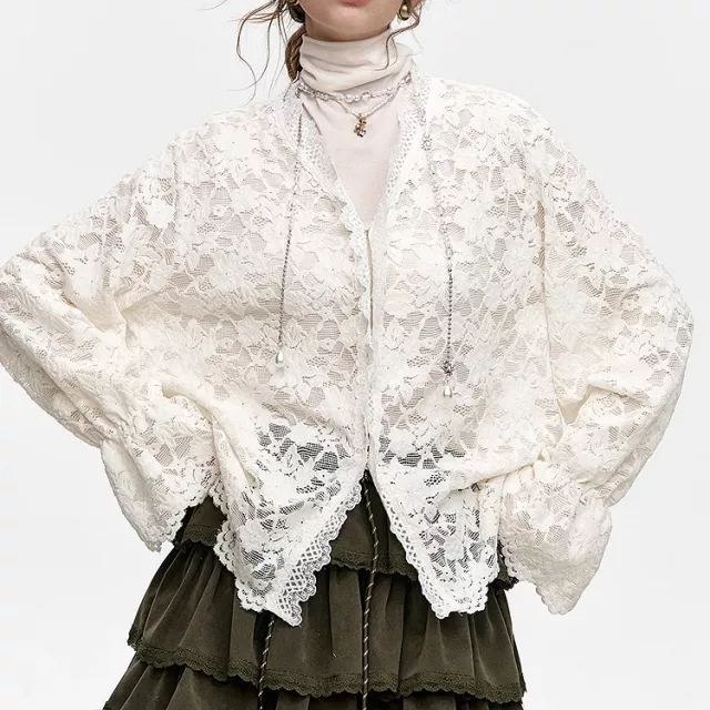 White Lace Layered Chiffon Shirt for Women – Semi-Transparent V-Neck Top
