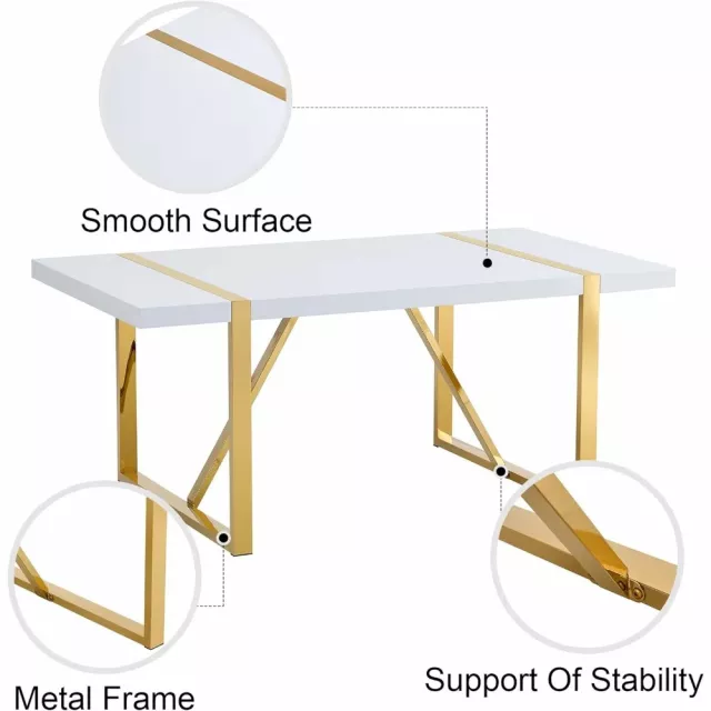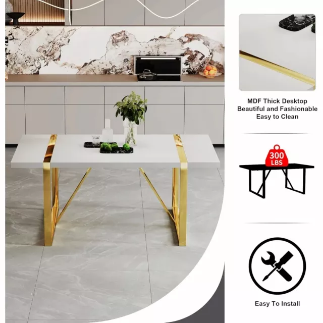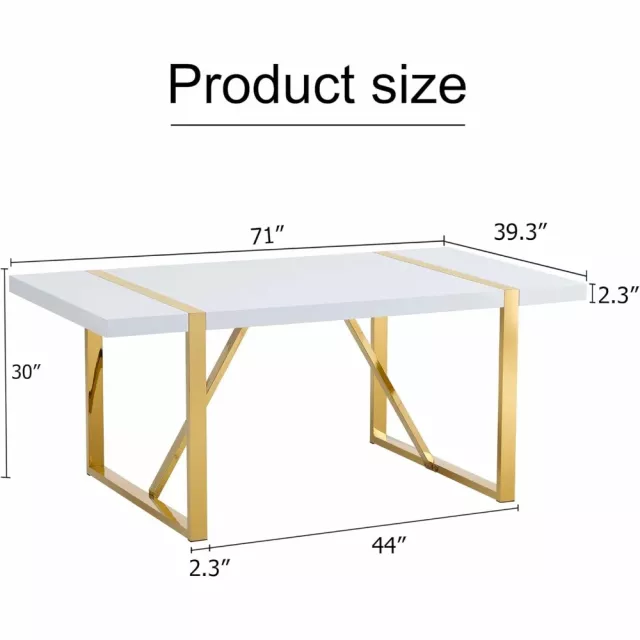 White Modern Dining Table 71″ for 6-8, MDF Top with Gold Stainless Steel Legs