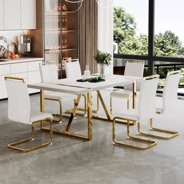 Elevate your home’s dining experience with this modern white dining table. Designed to blend seamlessly with various interior styles, this table features a sleek white MDF tabletop paired with stunning gold stainless steel legs. Whether you’re hosting family dinners or entertaining guests, this 71″ dining table provides ample space for up to 8 people. Its sophisticated look adds a touch of luxury, while its sturdy construction ensures lasting durability. A perfect choice for modern kitchens, dining rooms, or even as a study or coffee table.