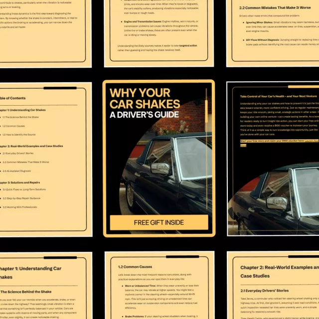 If you’ve ever felt your steering wheel vibrate, your seat rumble, or your entire car shake while driving, you know how stressful and confusing it can be. Why Your Car Shakes: A Driver’s Guide is a practical, easy-to-follow digital guide designed to help everyday drivers understand what’s really happening under the hood. Instead of guessing or immediately paying for expensive inspections, this guide walks you through the most common reasons a car shakes while driving and shows you how to identify, address, and prevent the problem with confidence.