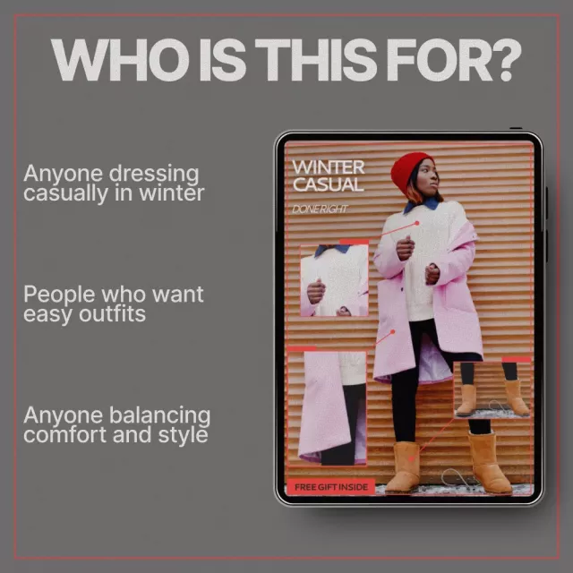 This ebook is perfect for anyone who wants casual winter outfits that feel intentional but never fussy. It’s ideal for busy professionals, creatives, parents, students, or anyone tired of complicated fashion advice that doesn’t translate to real life.