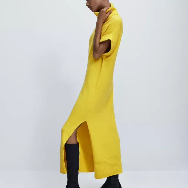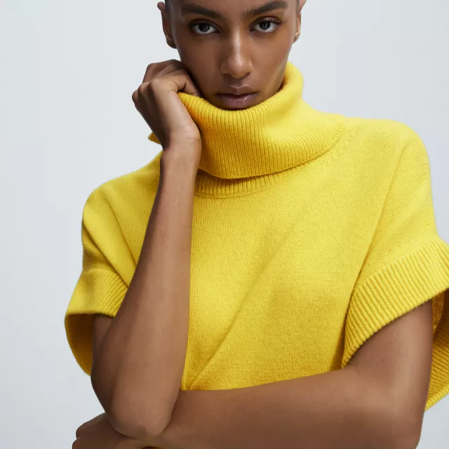 • Turtleneck neckline adds elegant structure and extra coziness in cooler weather.