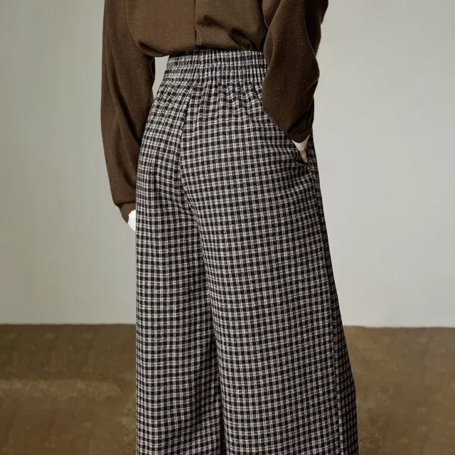 These pants bring together smart design and everyday wearability. The mid-rise elastic waistband ensures a secure, comfortable fit, while the full-length wide-leg cut creates a balanced, elongated shape—perfect for pairing with sweaters, blouses, or tailored outerwear. The tatting weave enhances durability, and practical pockets add convenience for daily use. With their classic plaid pattern, these pants easily transition from casual settings to polished looks, making them a versatile winter staple.