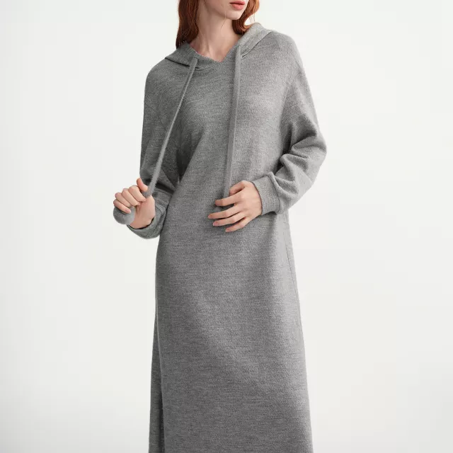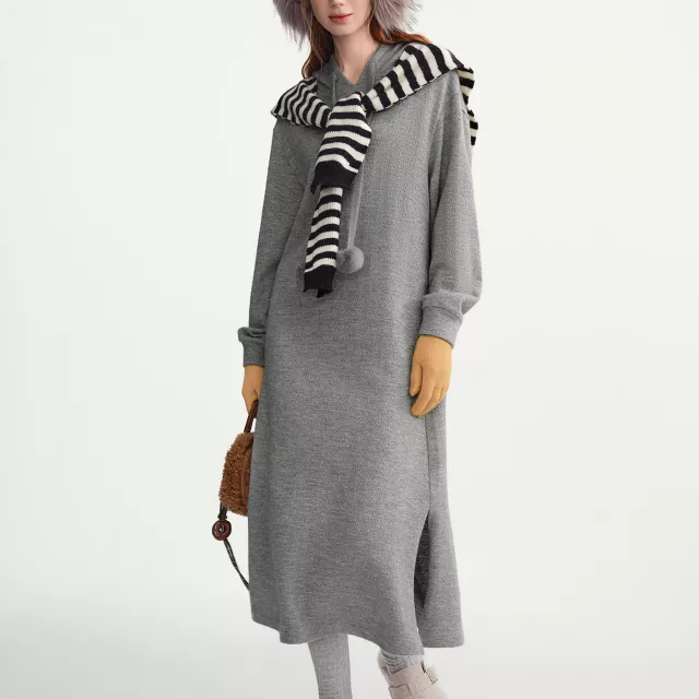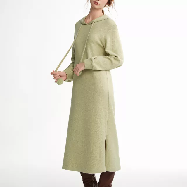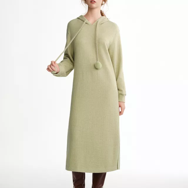This knit dress stands out because it blends winter-ready warmth with chic simplicity. The pom-pom hood adds character, while the flattering shape makes it an easy favorite for daily wear. It’s a piece you’ll keep reaching for all season—comfortable, stylish, and effortlessly wearable.