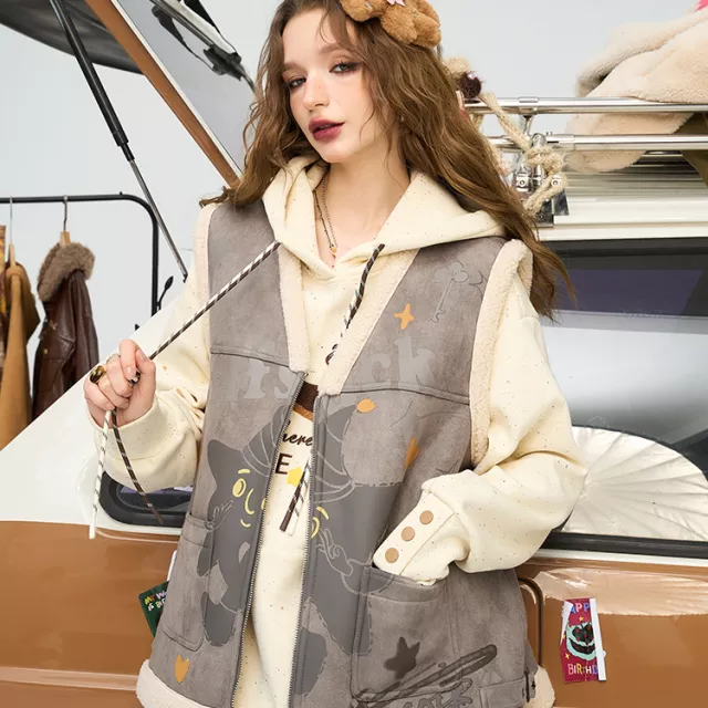 What sets this vest apart is its charming contrast of soft luxury and playful design. The full cartoon and star print gives it a fun, youthful look, while the suede-style fabric and furry texture keep it looking polished and stylish. The V-neck cut flatters the upper body and makes it easy to pair with layered necklaces or scarves. Plus, it has functional pockets and a front zipper for everyday convenience.