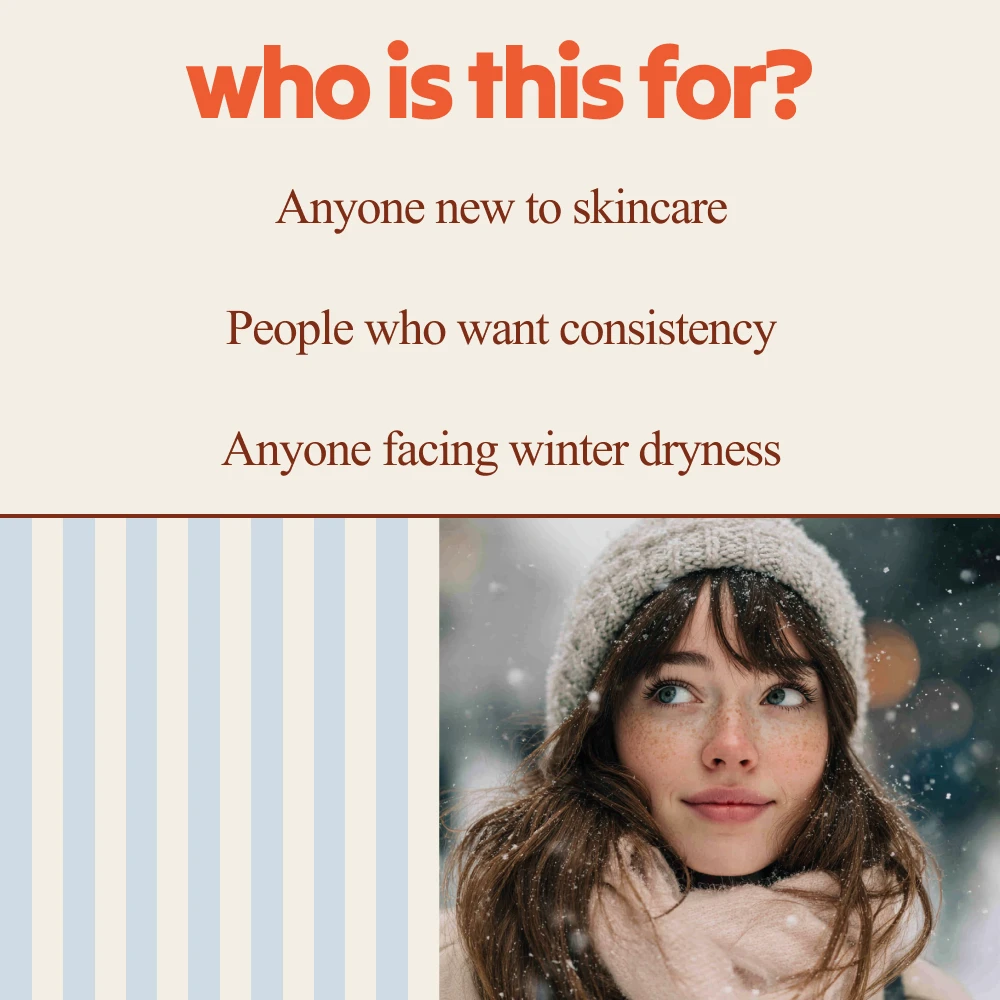 This bundle is ideal for anyone dealing with dry, sensitive, or dehydrated skin during winter. Itโs perfect if you want guidance thatโs practical, mindful, and easy to followโwithout complicated routines or expensive product pressure.