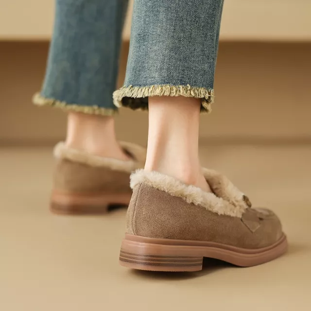 Embrace the winter season with these stylish and cozy loafers that blend timeless fashion with all-day comfort. Crafted from soft cow suede leather and lined with shearling, these loafers are perfect for colder months when you need warmth, comfort, and a touch of elegance in your everyday outfits. The slip-on design, complete with a chic tassel accent, makes these loafers easy to wear while still giving you that fashionable edge.
