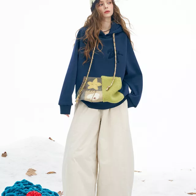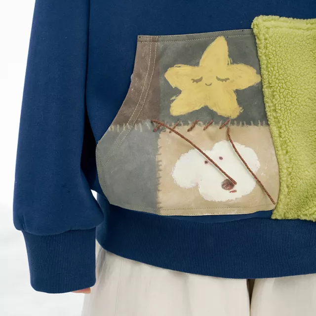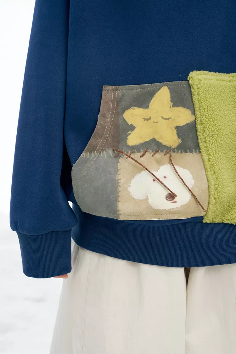 This cozy pullover is crafted from a medium-weight cotton and polyester knit, offering just the right amount of warmth for winter without feeling heavy. The drawstring hood adds extra protection on chilly days, while the twist-knot details and patchwork accents elevate its look with a unique, handcrafted feel. The loose fit allows for easy layering over tees or thermals, and the full-length sleeves keep you comfortably covered. Designed as a pullover with no full opening, it keeps heat in and cold air out effortlessly.