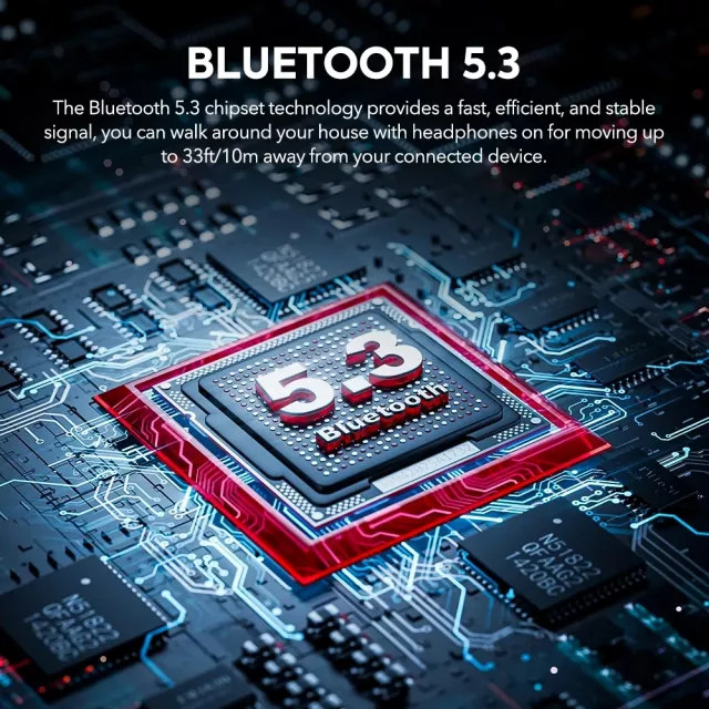 With the latest Bluetooth 5.3 technology, you’ll benefit from a stable and efficient connection up to 33 ft away from your device. The dual connection feature allows you to pair with two devices at once—so you’ll never miss a call while streaming music or watching videos. This makes it ideal for multitasking professionals and remote workers.