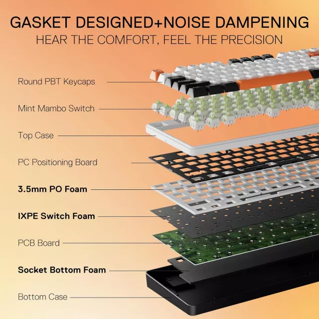 Enjoy silky-smooth keystrokes with custom linear switches enhanced by a gasket structure. This unique design ensures precise feedback while maintaining a soft, cushioned press. Multiple foam layers and dampening materials significantly reduce hollow noise, giving you ultra-clean acoustics and a more satisfying feel with every press.