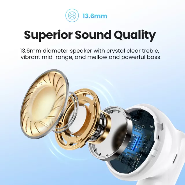 These wireless earbuds are packed with features that cater to your everyday audio needs. The latest Bluetooth 5.3 technology provides a stable, low-latency connection, ensuring your music and calls are smooth and uninterrupted. A 13.6mm dynamic driver delivers rich, vibrant sound with crystal-clear treble and powerful bass. The AI-powered dual-mic noise reduction technology filters out environmental noise, allowing you to focus on what matters most—your music and conversations. Plus, with an IPX5 water-resistant rating, you can confidently use these earbuds during workouts and in light rain.