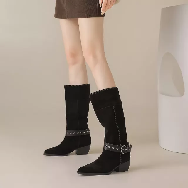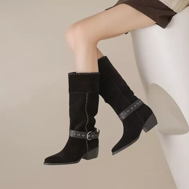 Bring timeless charm to your autumn wardrobe with these stunning mid-calf western boots. Crafted from premium cow suede, these boots combine a soft, velvety texture with a chic retro design. Featuring a sleek pointed toe and bold buckle strap, they add a touch of Western-inspired edge while keeping your look modern and versatile. Whether you’re dressing up for a night out or pairing them with jeans for a casual day, these boots are the perfect mix of style and comfort.