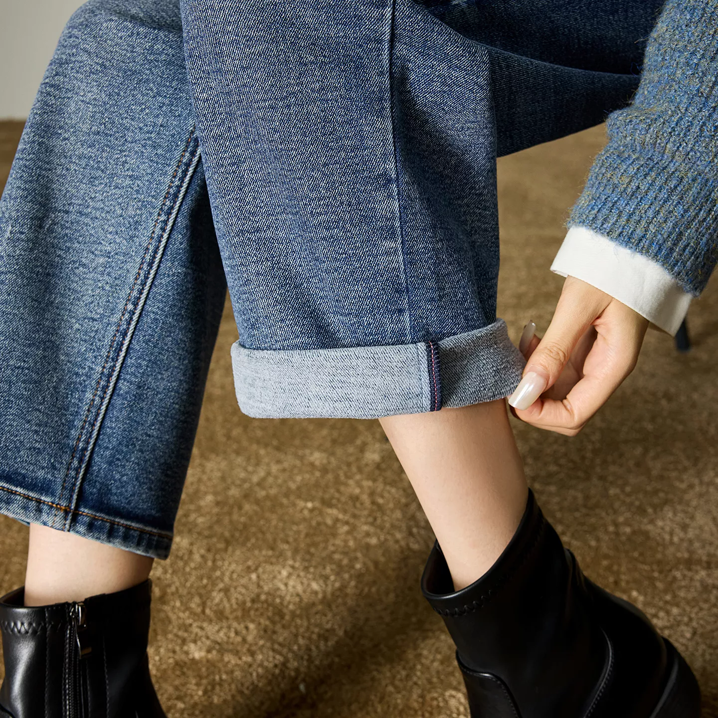The hidden fleece lining is what truly sets these jeans apart. It traps warmth without adding bulk, so you stay sleek while staying cozy. The fabric blends cotton, polyester, regenerated fibers, and a touch of spandex for a soft feel with slight stretch. This means they move with you during your busy day instead of feeling stiff or restrictive. The slim cut and cropped ankle length add a modern touch that pairs beautifully with both boots and flats.