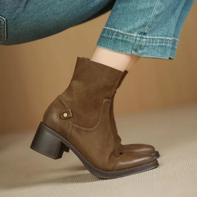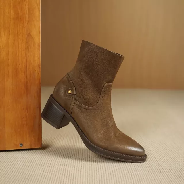 Women’s Genuine Leather Pointed Toe Chunky Heel Western Ankle Boots
