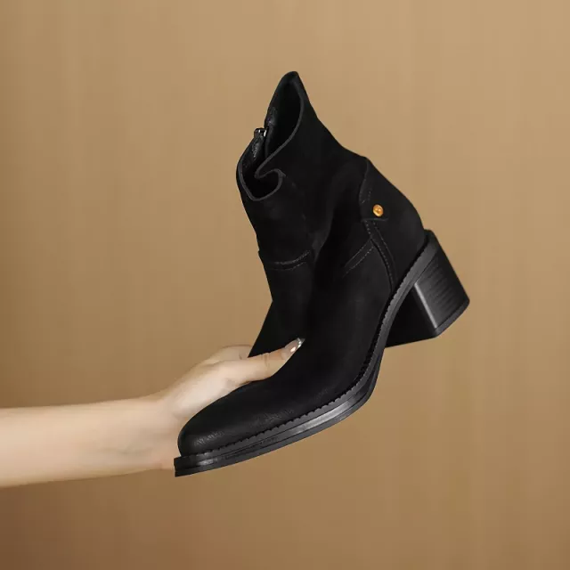Upgrade your style with these genuine leather western-inspired ankle boots. Crafted for women who love bold fashion with a touch of retro charm, these boots feature a sleek pointed toe, a stylish zip closure, and a comfortable chunky heel that gives you the perfect lift without sacrificing comfort. Designed to sit just above the ankle, they bring a modern twist to the classic cowboy boot silhouette.