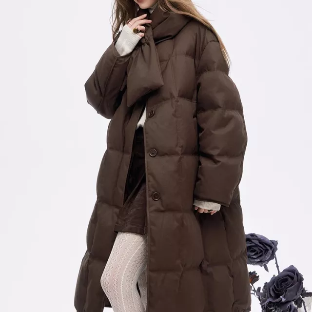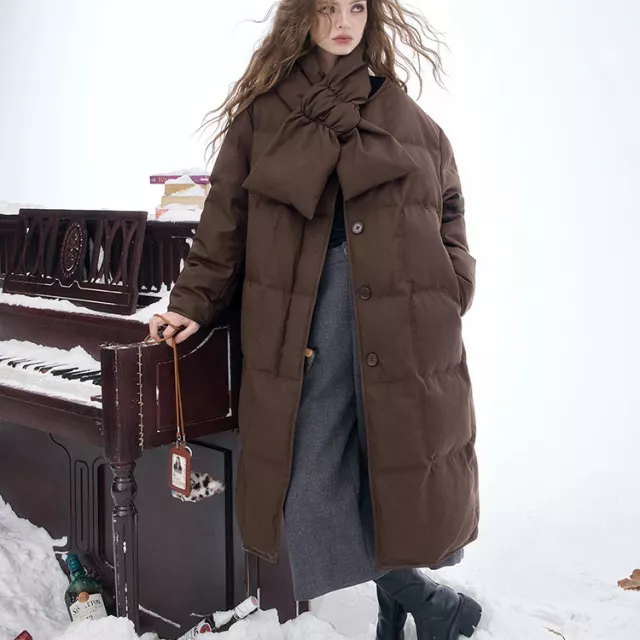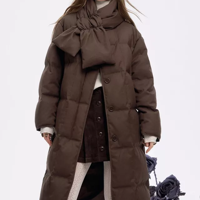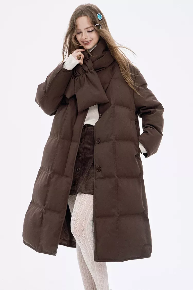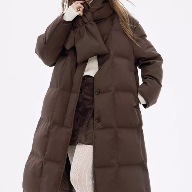 This long winter down jacket is designed for women who love comfort, clean style, and everyday practicality. It blends a preppy minimalist look with cozy warmth, making it a perfect outerwear choice for colder days. With its solid color design and built-in knit scarf detail, it keeps your outfit looking polished while protecting you from chilly winds.