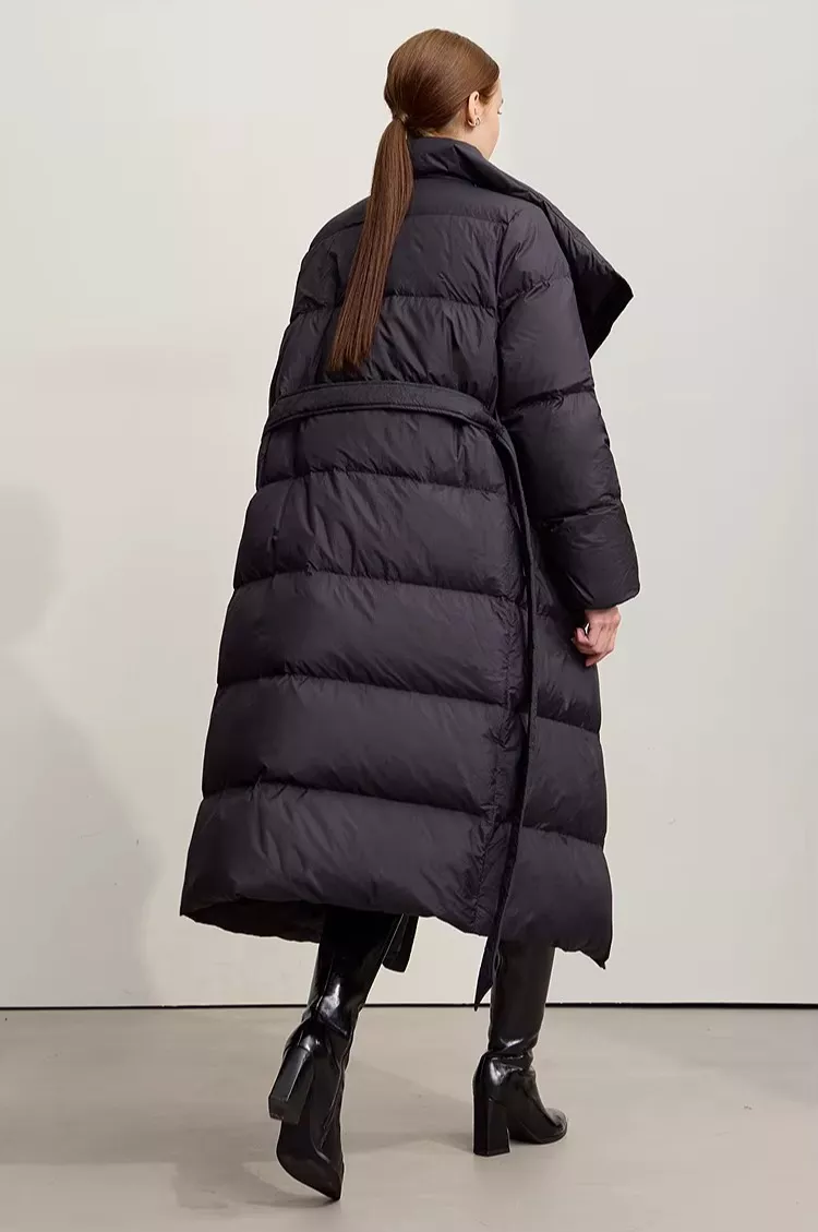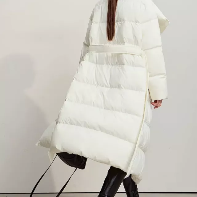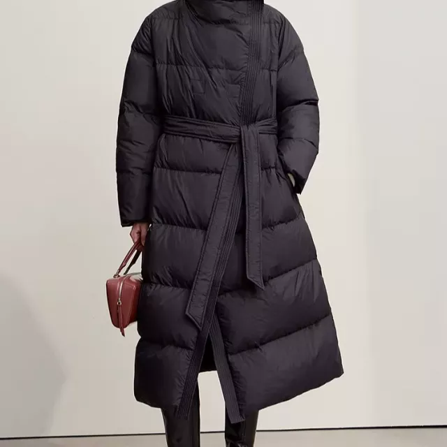 Step confidently into winter with this elegant long down coat designed for women who want both warmth and sophistication. Crafted with thick, premium white duck down and a soft woven nylon shell, this coat delivers exceptional insulation while keeping your outfit polished for work, weekends, and everything in between. Its wide-waisted silhouette and removable sash belt create a flattering shape, while the solid, timeless design makes it easy to pair with any wardrobe.