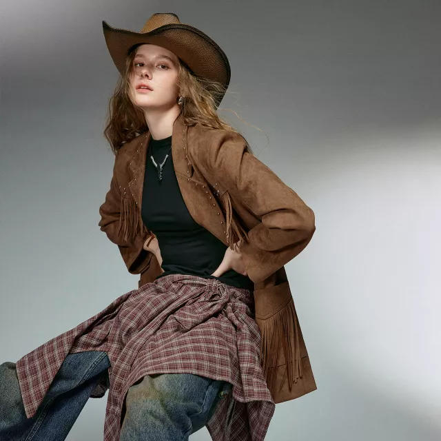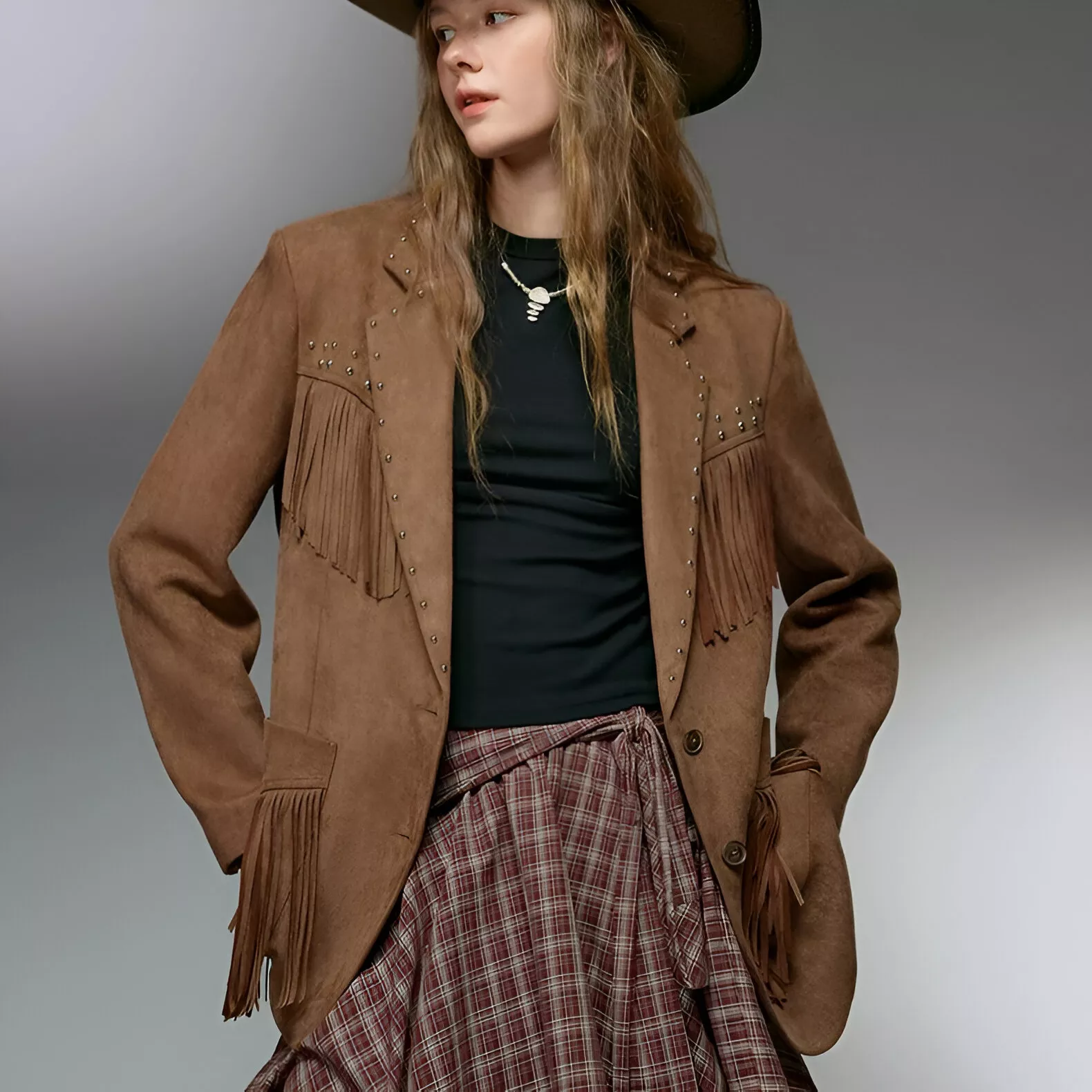 This women’s oversized blazer is not just another piece in your wardrobe – it’s an investment in style and comfort. Its unique combination of vintage charm and modern sophistication makes it an essential staple for any fashion-forward woman. The suede texture adds a luxurious feel, while the playful tassel and bead details make it stand out from typical office wear. Whether you’re pairing it with jeans for a weekend look or wearing it over a sleek dress for the office, this blazer ensures you look effortlessly chic.