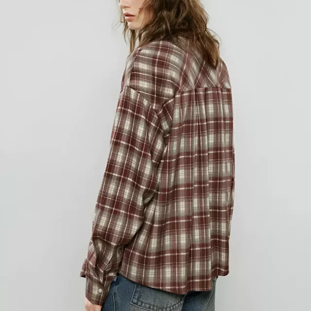 Women’s Retro Plaid Burgundy Flannel Blouse – Cozy Loose Fit Casual Shirt
