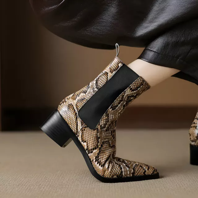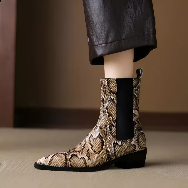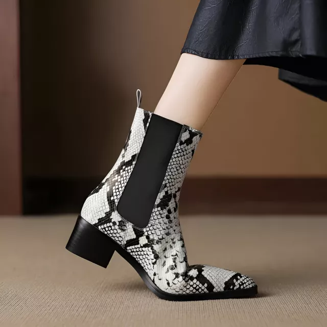 Make every outfit feel powerful with these sleek women’s western-inspired boots. Designed with a bold pointed toe and a subtle snake-pattern texture, they bring a modern edge to classic western style. The mid-calf height adds a flattering shape to your legs, while the smooth split leather upper gives a refined, premium look that works for both workdays and weekends.