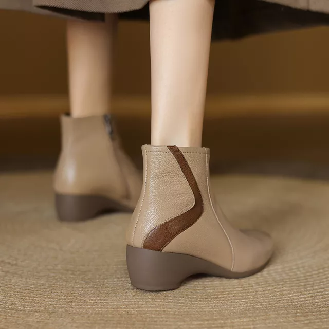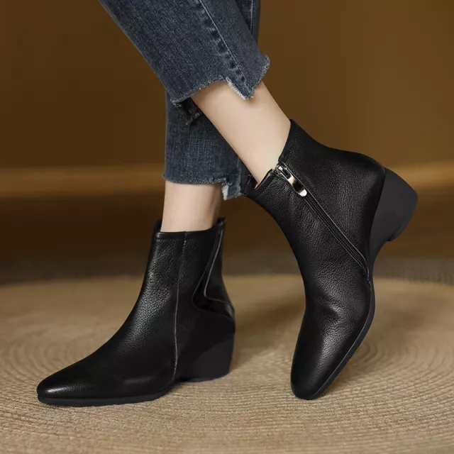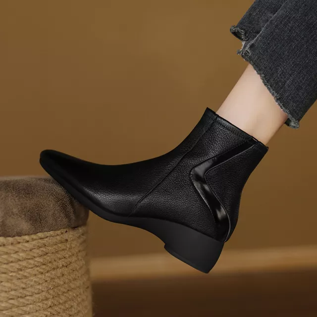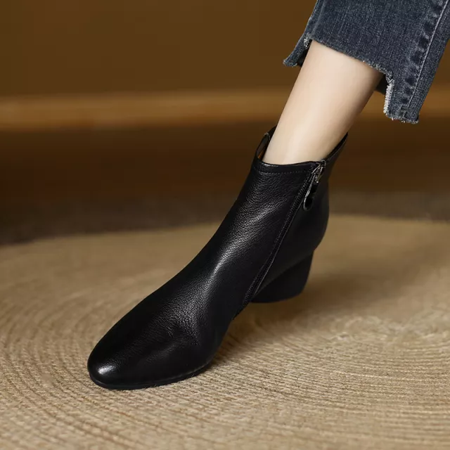Upgrade your wardrobe with these elegant ankle boots designed to combine fashion and functionality. With a classic round toe and a comfortable square high heel, these boots are perfect for adding a touch of sophistication to any outfit. The genuine cow leather upper and soft short plush lining ensure warmth and durability, keeping your feet cozy during chilly days. Designed with a sleek zipper, these boots are easy to slip on and off, offering convenience without compromising style.