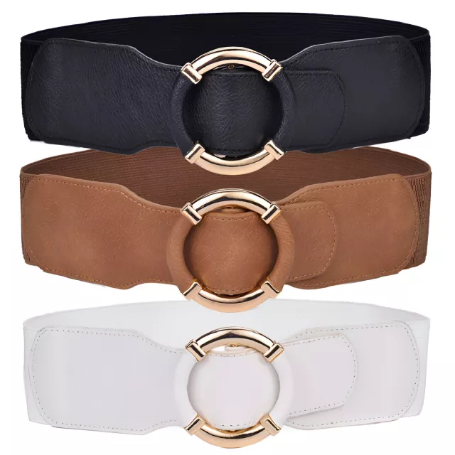 Women’s Wide Elastic Waist Belt with Gold Circle Buckle for Fashion