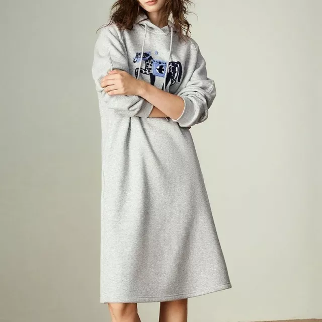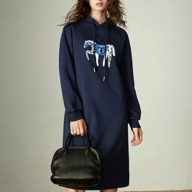 The beautiful horse embroidery adds a playful yet elegant touch, giving this dress a unique character that stands out from plain winter wear. The hooded neckline and raglan sleeves create a casual, sporty feel, making it perfect for everyday wear, work-from-home days, casual office settings, or weekend outings. Its knee-length cut pairs easily with boots, sneakers, or leggings for a complete winter look.